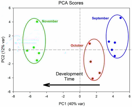 PCA of the purple carrot composition as a function of time showed a clear clustering of the samples along PC1 with a separation of the carrots harvested in September, October, and November (Figure 3).