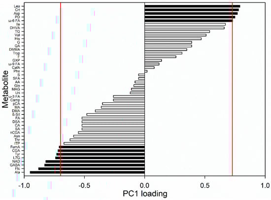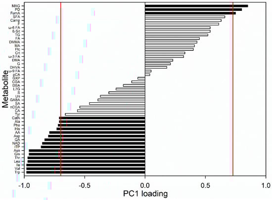 The normalized loading plot of the first component (Figure 4) shows which variables are important along with PC1 factor. The Pearson table for critical values for correlation was consulted, and variables with normalized loading values greater than 0.7 and lower than −0.7 were considered significant for the model (p < 0.05). Monoacylglycerols, 1,2-propanediol, and fumaric acid are the metabolites positively correlated with PC1 meaning that they are more abundant in carrots harvested in September. The levels of tryptophan, valine, isoleucine, leucine, threonine, glutamine, asparagine, inosine triphosphate, NAD, quinic acid, aspartic acid, acetic acid, histidine, phenylalanine, alanine, and caffeic acid are higher in carrots harvested at later months.