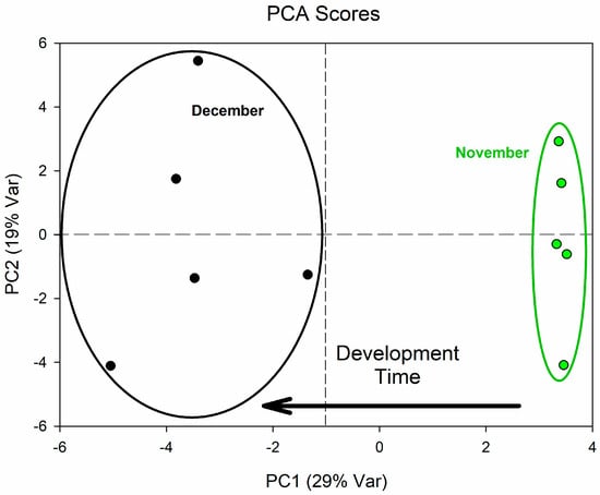 This analysis provided a six-component model whose PC1 accounted for 29% of the overall variance and whose PC2 accounted for 19%. Even in this model, it was possible to identify a time axis that was inversely proportional to the PC1 values since all samples harvested in November had a positive PC1 value, while samples harvested in December showed negative PC1 values.