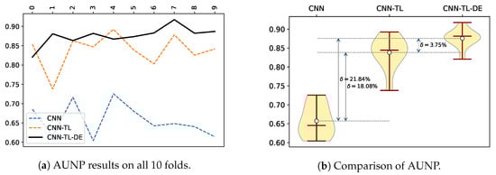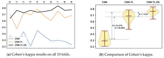 As the key aspect of the proposed method is to find the optimal values of hyper-parameters using the DE approach, we wanted to see what were the actual final values as obtained by the CNN-TL-DE method. All the obtained values for all ten folds are presented in Table 8. The optimal values differ from one fold to another. Unfortunately, this does not allow one to find and fix one general set of optimal hyper-parameters and then just use them for training. From the results, we can see that the most often used optimizer type is adam and the most optimal learning rate is between 0.00005 and 0.0001. The dropout probability of the spatial two-dimensional dropout layer should be lower (0.1–0.4) than that of the regular dropout layer (typically 0.4–0.7, but with higher variance). Finally, the number of neurons in last fully-connected layer was set quite diverse, from the lowest 64 neurons to the highest 2048, with the later being the most frequent choice.