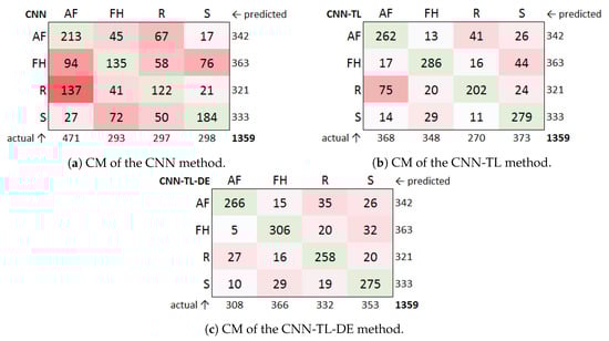 Comparison of confusion matrices of the three methods on test data (AF, American football; FH, field hockey; R, rugby; S, soccer).