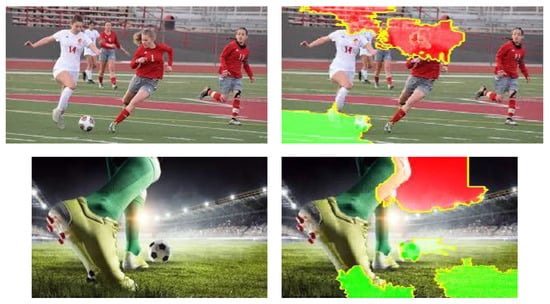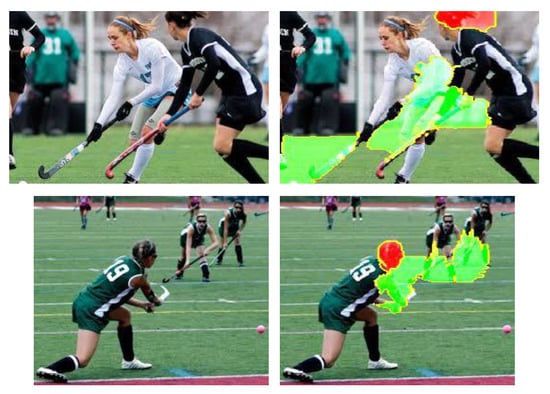 Figure 7, Figure 8, Figure 9 and Figure 10 present some images with their corresponding interpretable representations generated with the LIME technique. Green colored pixel groups (super-pixels) indicate identified regions with a positive impact towards a particular sports discipline, while the red pixel groups indicate the regions with a negative impact towards this same discipline. In other words, the green regions represent the decisive features, because of which an image has been classified to a specific sport.