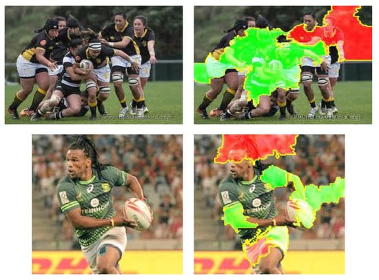 Examples of how LIME explained classifying images as rugby. Here, the packed formation of athletes and the rugby ball are decisive for classification; again, general features of athletes do not contribute to classification.