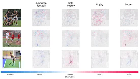 Similarly, Figure 11 shows some images with their interpretable representations generated with the SHAP method. SHAP provides a separate interpretation for each class, where red pixels indicate parts of image with a positive impact towards specific class, while blue pixels indicate parts with a negative impact. It can be easily seen how the hockey stick, for example, is decisive for classifying an image as field hockey, or the soccer ball for soccer.