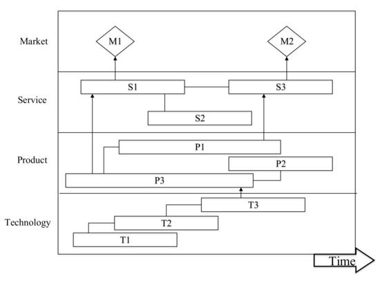 To improve the capacity of SMEs to capture new opportunities in future markets, technology and products, the attributes of sustainability and low costs need to be considered preferentially in R&D management. As a widely used technique in R&D management, TRM is beneficial for organizations to plan their technologies by explaining the technologies, products, services and markets, which are the four layers obtained from previous studies. Each layer has its specific characteristics; for example, the market layer in the top is relative to trends of market, current needs of customers and potential customers, and it contains information on future development. In the middle, the service and product layers are related to the current service and functions and promising functions of products that customers need. At the bottom, the technology layer is related to the crucial information on trends of technology and issues of future [6,7].