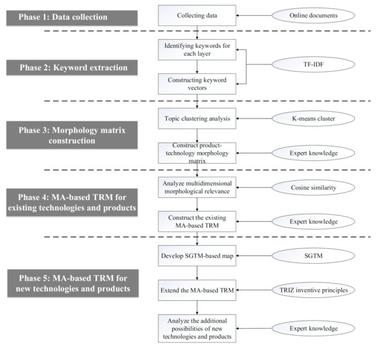 The whole process in this paper consisted of five phases, as shown in Figure 2. First, proper data sources were identified to provide the MA-based technology roadmap for each layer. Patent documents and product manuals were collected from two different datasets for the TRM. The second phase was to find out the keyword list for each layer, denoting the technology and product shapes. Text mining tools were applied in keyword extraction and relative keyword vectors were generated consequently. Third, morphological matrix was constructed in this phase. K-means algorithm, the topic cluster algorithm and cosine correlation coefficient were applied to analyze the interconnections among the collected keywords. Following the identification of the relations among keywords, the overall morphology matrix of the target research field was constructed for the definition of possible configurations of products and technology, providing opportunities for novel products and technology to be developed. Fourth, based on the morphology matrix, the existing TRM was accomplished by evolving the technological and product part of the roadmap based on the similarity between each pair of nodes, representing the multidimensional morphological relevance in this study. Finally, the SGTM-based map was established to identify sparse areas based on the extracted keywords, which contain the potential to future development. The MA-based TRM was extended through the SGTM-based maps during the technology foresight process and improved TRIZ inventive principles were used in concretizing the target field future development path. The additional possibilities of new technologies and products were analyzed by experts.