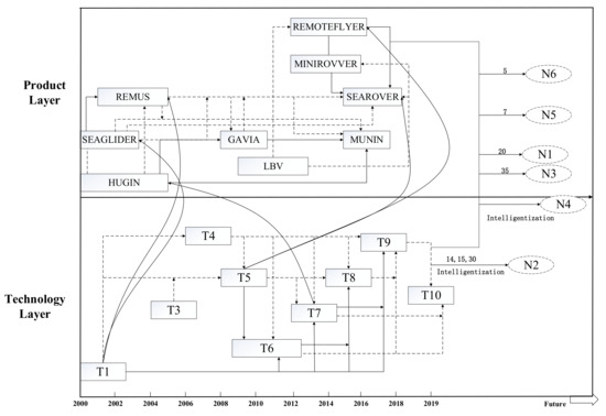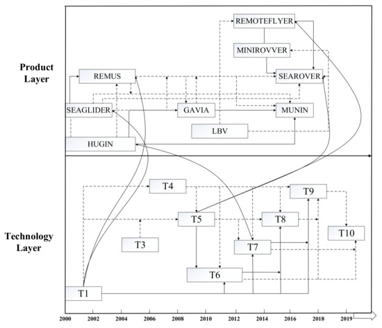 After building the linkages between each technology node, product node, technology and product nodes, the MA-based TRM for existing underwater vehicle technologies and products is depicted in Figure 3. In the TRM, the technology and product trends are revealed to guide organizations to discover new opportunities and plan technology and product strategy.