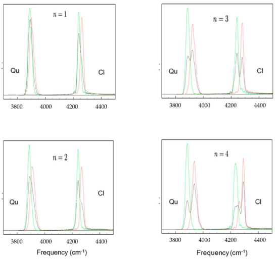 Schrödinger H–H spectra for large-cage occupations of n = 1, …, 4 at 100 K, with classical molecular dynamics (MD) results. Black lines represent total spectra over all H2 molecules, red lines represent spectra of large-cage H2, green lines represent spectra of small-cage H2. “Qu” refers to quantum, while “Cl” denotes classical.