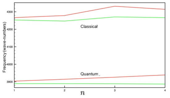 Average frequency positions for classical and Schrödinger large-cage (red) and small-cage (green) spectra.
