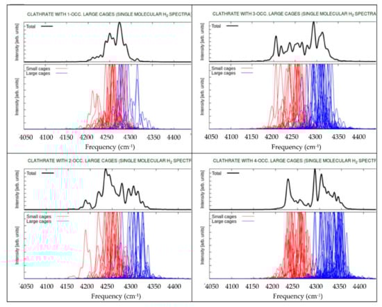 Figure 1 depicts the Schrödinger and classical MD sampled H–H spectra for the four large-cage occupations. A systematic redshift of ~350 cm−1 is clearly evident for the quantum case vis-à-vis its classical counterpart for all occupations, regardless of cage occupation or type (cf. Figure 2). This puts the Schrödinger-solved H–H stretch results in slightly superior agreement with Raman-measured data at 260 K of ~4050–4150 cm−1 [34,45,50], although these quantal results systematically underpredict H–H stretch modes, whilst classical MD overpredicts. This “reversed error sign” situation is not altogether ideal if one seeks true quantitative accuracy, but several mitigating factors must be borne in mind in this respect. Although ref. 4 presents a relatively accurate pairwise potential model, it is, of course, imperfect and cannot capture all of the subtleties of H2–H2 and H2–water interactions. Although care has been taken to define the H–H stretch coordinate, there may be some residual background translational and rotational H2 motion; for the case of quadruple occupation, with the H2 molecules more localized spatially—essentially “hemmed in” to their tetrahedral configuration [2,3,35,36]—this point is less of a difficultly. Naturally, depending on occupation, one to four independent one-dimensional Schrödinger equations are solved per large cavity, and it is assumed that each H–H vibration is independent of others. This assumption may be somewhat questionable and serves to further explain the lack of full quantitative agreement with experimental results [34,40,45]. Of course, the distribution of experimental cage occupations is not well characterized or known [34,40,45], which hampers further attempts for quantitative comparison between measured Raman spectra and H–H vibrational spectra; in the present work, and the DFT-based work of ref. [45], there were found to be distinct and distinguishable differences between large-cage frequency modes and occupations (as will be discussed below). Interestingly, there was no evidence of peak “bifurcation” or splitting in each cage type, except for the case of quadruple occupation in the large cage for classical MD, which was suppressed in the Schrödinger case. Of course, to study mode-splitting effects with greater rigor, state-of-the art DRSLL is very helpful, albeit that PIMD or a Schrödinger equation approach therewith would be very computationally demanding (as discussed further below).