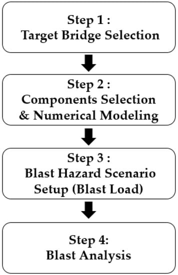 To evaluate the performance of cable-stayed bridges under different blast loads, the aforementioned studies analyzed the overall behaviors and damage characteristics of bridges by modeling either the deck and pylon only or the entire structure [14,15,16,17,18,19,20,21,22]. Furthermore, when setting the blast loads, they often chose randomized blast loads, rather than setting them according to specific scenarios [14,15,16,17,22]. Most of the existing studies have focused on the behaviors of entire bridges, and very few cases have analyzed the damage types or levels of major components (e.g., the cables) according to different scenarios. Therefore, this study conducts blast analysis by defining a detailed finite element model for the major components of the target bridges and setting appropriate blast scenarios, as shown in the procedure in Figure 1. Furthermore, the effects of the blast load are examined by analyzing the component responses and damage types.
