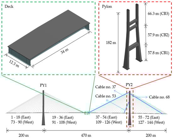 To analyze the performances of the major components of a cable-stayed bridge under a blast load, we selected the target bridge as shown in Figure 2; it is a cable-stayed bridge featuring three spans, with a main span length of 470 m and a side span length of 200 m. It is a composite superstructure formed of precast reinforced concrete (RC) slabs and steel girders (edge girder, center stringer, and crossbeam). The deck is 310 mm thick near the pylon and 260 mm thick in other sections, and it is made of 68 standard segments (length (L) = 12.3 m). In addition, the bridge features 144 cables of varying areas and lengths and two RC pylons (PY1 and PY2), which contain hollow sections. To evaluate each component of the cable-stayed bridge, a single 260-mm thick segment at the center of the span was selected from the superstructure. We selected the following cables for analysis: Cable no. 37 (area (A) = 0.012450 m2, L = 252 m), which is the longest cable, has the largest cross-sectional area, and extends to the mid-point of the superstructure; Cable no. 53 (A = 0.005185 m2, L = 81 m), which has the smallest cross-sectional area; and Cable no. 68 (A = 0.009385 m2, L = 206 m), which is attached to the side span, where the largest stress is applied. We selected PY2 as the pylon; its base segment (CB1 in the figure) is 2.37 m taller than that of PY1.
