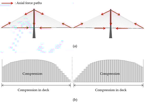 Axial force in cable-stayed bridge: (a) axial force paths and (b) axial force in deck.