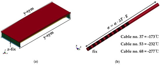 For the cable models, translational DOFs of surface nodes at each end region are constrained considering the anchored length. Thermal load is utilized to apply the initial stresses of each cable model of nos. 37, 53, and 68, which are 415, 556, and 665 MPa, respectively. For thermal load analysis, the temperature change is calculated using the thermal stress Equation (2) with the general thermal expansion coefficient of steel, 1.2 10−5/°C. The calculated temperature drops are −173, −232, and −277 °C for Cable nos. 37, 53, and 68, respectively.