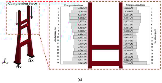 Initial loads and boundary conditions of each numerical model of the bridge components are shown in Figure 7. As previously mentioned, only self-weight is considered as the initial load for the deck model. As a boundary condition of the deck model, the longitudinal symmetry condition is considered, and the z-directional translation is constrained at the location of cable anchorage.