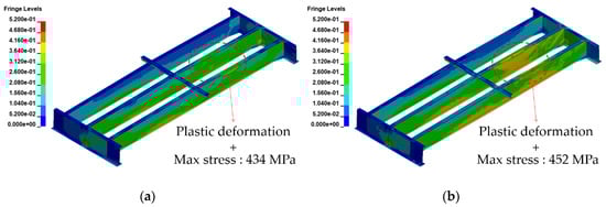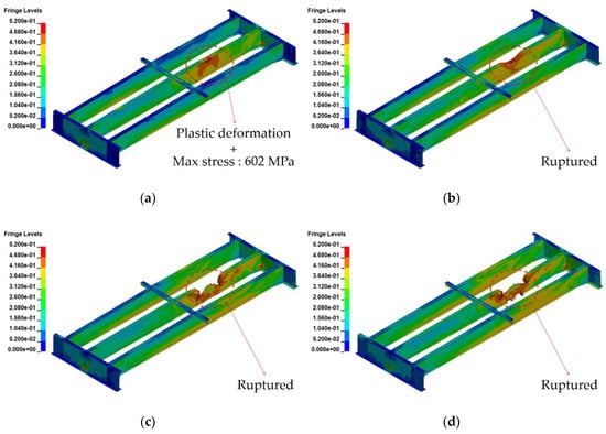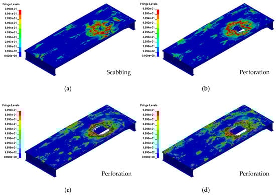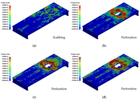 Figure 9, Figure 10, Figure 11 and Figure 12 show the damage and effective stress contours generated by the blast load. The fringe range of the effective stress contour was set to 0–520 MPa, considering the ultimate strength of the steel girder; the resulting output time was 0.05 s, at which point the analysis was terminated.