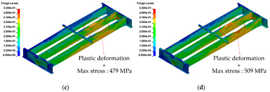 Effective stress contours of the steel girder (between the crossbeams): (a) Scenario A, (b) Scenario B, (c) Scenario C, and (d) Scenario D (fringe level unit: MPa).