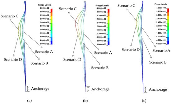 Effective stress contours of cables: (a) Cable no. 37, (b) Cable no. 53, and (c) Cable no. 68 (fringe level unit: GPa).