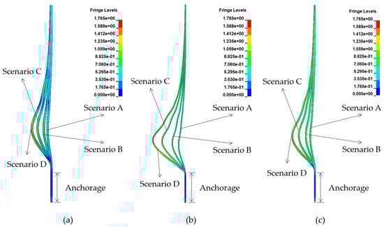 Table 8 presents the maximum displacement and maximum effective stress of each scenario when a blast load was applied to each cable selected in this study (see Figure 2). The displacements and effective stresses on the cables increased with the blast load. In scenario D of Cable no. 53, a momentary stress was found to exceed the static tensile strength (fpu) of the cable (1765 MPa); however, no damage or breakage was observed, owing to the strain rate effect of the material. Furthermore, when the initial stress was excluded, the stresses resulting from the blast load only were found to be approximately 531–1292 MPa for Cable no. 37, 824–1258 MPa for Cable no. 53 and 646–1095 MPa for Cable no. 68 depending on the scenario. Cable no. 37 is observed to have the largest stress variation compared to the initial stress of the design. The reason for this is that Cable no. 37 has a maximum diameter, or maximum blast load reception area. In addition, the maximum displacement and the maximum effective stress occurred on Cable no. 53, which has a minimum cable diameter. These results suggest that the diameter of the cable has a greater influence on the behavior of stay-cables under blast load, or a cable with a small diameter is more vulnerable to blast load. Figure 13 and Figure 14 show the displacement and effective stress contours resulting from the blast load. The fringe range of the displacement contour was set as 0–400 mm, and that of the effective stress contour was set to 0–1765 MPa, considering the tensile strength of the cable. The result output time was 0.18 s and 0.05 s, at which point the maximum displacement and effective stress have occurred.