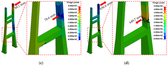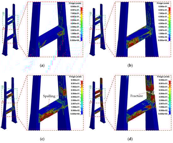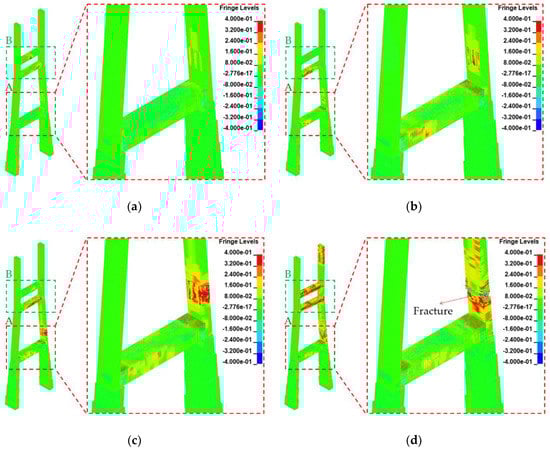 Damage contours of the pylon: (a) Scenario A, (b) Scenario B, (c) Scenario C, and (d) Scenario D.