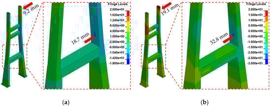 Displacement contours of the pylon: (a) Scenario A, (b) Scenario B, (c) Scenario C, and (d) Scenario D (fringe level unit: mm).