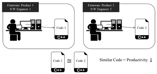 Firmware software developers at a company are typically responsible for developing a software program that operates a product. A company always seeks to provide a streamlined work process for firmware software developers to increase productivity as the process leads to saving money for the company. One potential barrier for increasing productivity is to spend considerable time writing code that is particularly due to a repetitive task. Another potential problem is that firmware software developers may be generating similar codes simultaneously as they are separately involved in developing different hardware products. Figure 1 notionally illustrates the issue where we noticed that two firmware software developers separately worked on each code that was eventually similar to each other. This situation could prevent them from working efficiently if they would need to handle a large volume of source codes, resulting in decreasing productivity. Thus, a need to develop a framework that helps firmware software developers work efficiently has been identified in this research.