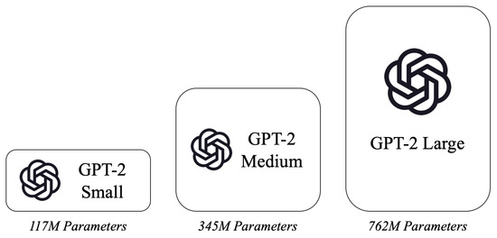 The GPT models are transformer-based language models trained on a massive text dataset from the websites. Depending on the size of neural network weight parameters, the GPT-2 models are classified into small (i.e., 117 M), medium (i.e., 345 M), and large (i.e., 762 M) pre-trained models, as shown in Figure 2. Here, 117 M means that there are 117 million parameters of the neural network model. The obvious upside of the GPT models is that the pre-trained models can be easily tailored to various domain-specific language modeling tasks, given that the models are fine-tuned with domain-specific training datasets. For this reason, the GPT models have been widely used for a variety of domain-specific tasks such as speech recognition and language translation.