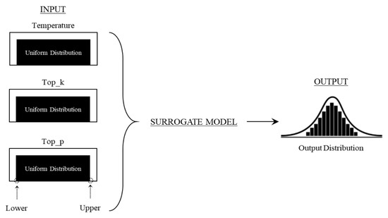 We utilize the Monte Carlo simulation (MCS) technique to see the trend of resulting outcomes generated from the MLP-based surrogate model. Uniform distribution with min/max values is used for the GPT-2 model’s diversity parameters. The MCS is then performed with 1,000,000 sample points generated by the uniform distribution of the GPT-2 model’s diversity parameters, which are eventually incorporated into the MLP-based surrogate model to yield statistical distributions. Figure 10 notionally depicts the MCS process flow diagram especially used in this research (i.e., input and output mapping).