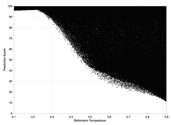 The Boltzmann temperature is one of the GPT-2 model diversity parameters that control randomness in the sampling process. Figure 11 shows the MCS results with respect to the Boltzmann temperature. Lower and upper bounds are specified with 0.1 and 0.9, respectively. A black dot represents one experiment case generated by the MLP-based surrogate model with three different input variables randomly sampled from the uniform distributions with respect to the GPT-2 model’s diversity parameters. As can be seen from Figure 11, it seems that decreasing Boltzmann temperature (i.e., x-axis) keeps the model to generate a high prediction score (i.e., y-axis), while increasing Boltzmann temperature causes the model to tend to frequently have a low prediction score. Based on these observations, one may claim that the model with lower Boltzmann temperature value, named deterministic design in this paper, would be the best option to predict the most likely next code element as the deterministic design strives to minimize the degree of surprise in model output. However, it is too early to draw such a conclusion, because the model with a higher Boltzmann temperature value, named probabilistic design in this paper, would provide a list of reasonable next code elements in which one could select it manually to increase prediction accuracy. Details will be discussed in the section of model evaluation.