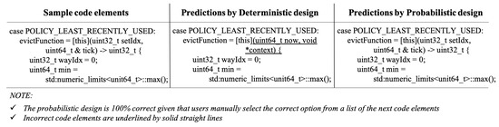 Figure 16 shows how deterministic and probabilistic design predicts the next code element differently based on the same user-defined input. As can be seen, the deterministic design generated the only one output that would be the most likely (i.e., 100% probability) next code element in the prediction process. Unfortunately, this prediction was incorrect for this particular case even though the deterministic design was typically able to predict correctly in most cases. In other words, the reason why the deterministic design would not be able to predict the code element correctly for this case was that it would automatically select the option with the highest prediction probability. On the other hand, given the same input code element, the probabilistic design generated a list of the most likely next code elements with a certain probability. This approach enabled the users to select the option manually from the list that included the correct code element based on previous input. For example, although the option with the highest probability (e.g., [this](unit_64t ) was incorrect for this particular case, the probabilistic design was able to increase prediction accuracy by allowing the users to select an option (e.g., [this](unit_32t) manually. Thus, there was no discrepancy with the probabilistic design given that the user could manually select the candidate from the list of options (e.g., choosing an option with 20% probability instead of an option with 80% probability).