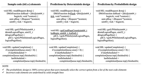 Figure 15 shows the results of predictions by the deterministic and probabilistic design for the sample code element from Figure 14. Incorrect code elements are underlined by solid straight lines. This result indicates that the probabilistic design is better than the deterministic design with respect to similarity, especially for the sample code element. Here, it must be noted that the probabilistic design is 100% correct as the users could select the correct code element after the framework suggest a list of the most likely next code elements. Furthermore, it is worth mentioning that the deterministic design is capable of predicting the correct next code elements in most cases; however, it sometimes produces the model output in some unexpected ways.