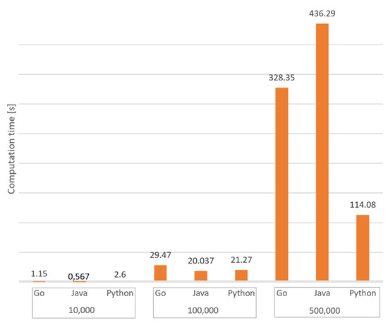 The computation time required to predict the target variable is taken into account; in the case of a database containing 10 thousand records, the best results were obtained for Java. A big surprise was receiving much longer computation time for the Python language. The Golang language was, in this case, in place 2. It should be noted that entirely different results were obtained for more massive datasets. Along with the increase in the number of data, the Python language results improved significantly concerning competing languages. In a situation where the database contained half a million records, Python did best, then Golang, and Java did worst. In the case of 100 records, the differences between the individual languages were the smallest. To verify the results obtained, we made several series of computations. Due to the fact that the results of these series are similar or even identical, their average values are given. The obtained results, presented in Table 3 and Figure 3, Figure 4 and Figure 5, confirm a certain level of results obtained for particular programming languages and data set sizes. The obtained results demonstrate that in the case of using software for the current analysis of large data sets collected, e.g., in production processes, it is recommended to use Python and then the Golang language. In the case of small data sets, possible differences may be less significant. In addition, Java is optimized to maximize application throughput (e.g., the number of processed user requests sent to the webserver, amount of processed data, etc.) High throughput results in more increased delays. Golang, for example, is optimized for low latency from the beginning. While the bandwidth would be lower, user requests would be processed faster. This makes Golang the ideal solution for production systems that often require quick decisions and reactions to changing working conditions.