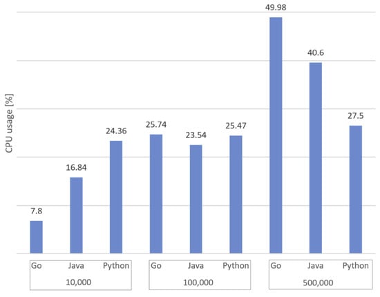 In Table 3 and Figure 5, the use of the CPU is presented. As one can see, the results are very different. In the case of a smaller number of data, the Golang language was the best in this list. On the other hand, when the number of records reached 500 thousand, the same language was the most loaded on the CPU. The vital information is that in the Python language, regardless of the number of data, the CPU usage was similar.