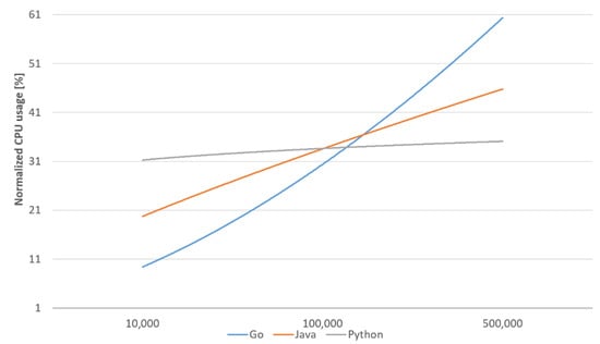 In the case of RAM requirements, the worst results in the whole ranking were achieved by Java. For more massive datasets, both Golang and Python scored well. One can say that both languages are comparable in this aspect. On the other hand, a significant difference in favor of Golang was obtained for the smallest number of records (10 thousand). The results presented in Table 3 and Figure 4 show that the Golang language can be used in embedded IoT systems also used in Industry 4.0, where the effective use of RAM should be taken into account (e.g., when it is not possible to expand these systems in this aspect). Very often, IoT systems have generally limited resources, including power, memory, CPU power, etc. Usually, these are not systems that can be easily scalable, and in many cases, this is even impossible. Therefore, individual programming languages’ ability to make more efficient use of, e.g., RAM can contribute to their application potential. The good results obtained for the Golang language result from the GC (garbage collector) implemented in it. This mechanism is designed to remove useless elements and thus free up memory. This process takes place simultaneously in the case of the Go language. Therefore the released memory is ready for reuse. Of course, such actions also have their costs, e.g., in the form of additional CPU load. Another feature of Golang related to memory management is memory allocation using different memory structures with varying cache levels for objects of various sizes. Splitting a single block of consecutive addresses received from the operating system into a multi-level cache improves memory allocation efficiency by reducing blockages. Then, allocating the memory allocation according to a specific size reduces memory fragmentation and facilitates a faster GC after memory release.