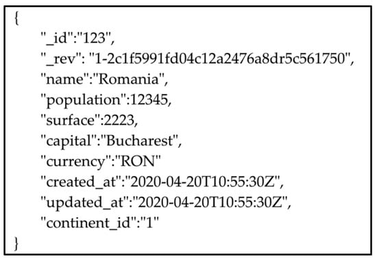 Each document must contain all the data for every entity, so, for example, to enter a city, the document must contain all the data of the continent, the country, and later of the city. Those can contain a single country, a single city, a single hotel, or a single restaurant. A document that contains information about a hotel represented using CouchDB’s second structure is presented in Figure 3.