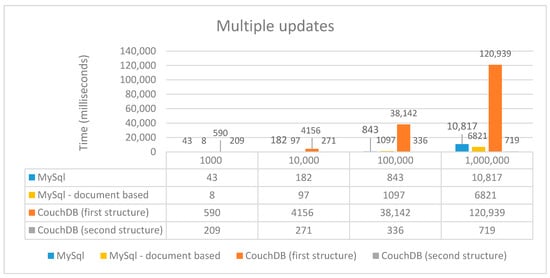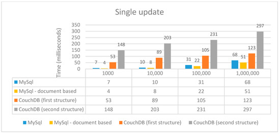 A simple update is much faster in document-based MySQL than in relational MySQL or CouchDB, regardless of the number of elements involved. For the second structure CouchDB, regardless of whether a simple update or multiple updates are carried out, a request is made, which automatically depends on other factors (such as the Internet, exceptions may occur, such as TimeoutException or Connection refused). The most common exception was TimeoutException and it can occur because the internet is weak: it takes too long for the CouchDB server to respond and if it gives a timeout, a retry is made a certain number of times, the reason for which execution times are longer than MySQL and the first structure of CouchDB.