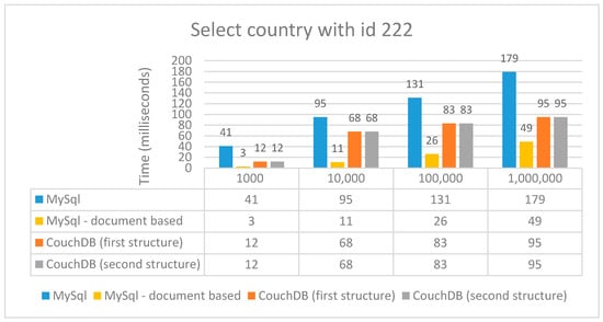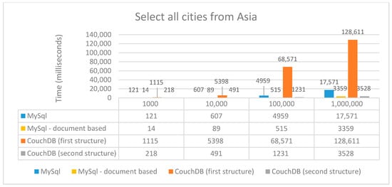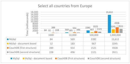 Using the second structure, the selection is made through a single request in which all the documents from the continent of Europe were obtained. The next step was to interpret the answer and extract them. If only the countries were needed, all the documents that do not have a city were taken and finally, a list of all the countries was obtained. The command used for document-based MySQL is found for which we give as a parameter the search condition. The resulted response times differ greatly between MySQL and CouchDB, as shown in Figure 8, but there may be situations where the request may fail for various reasons (e.g., TimeoutException, Connection refused), and if we have dealt with this case by retrieving it several times, the times for CouchDB will increase automatically.