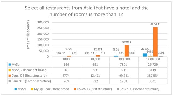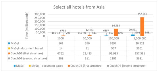 Using the second structure, the same request was executed, and at the end, after interpreting the answer, all the hotels were extracted and checked to add it only once to the final list. From Figure 10, it can be seen that again, the first structure used in CouchDB requires the longest response time, due to a large number of requests. Overall, document-based MySQL has the best performance. For a large number of elements being still comparable with CouchDB’s second structure. Also, it can be noticed that the relational MySQL approach exhibits good results for a small number of elements.