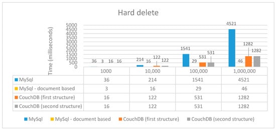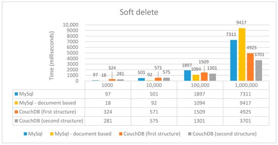 Regarding soft and hard deletion, response times, in this case, are longer for relational MySQL compared to CouchDB or document-based MySQL, as the number of elements is increasing; however, the differences between performance times between CouchDB first and second structure were not so big as for the other types of operations.