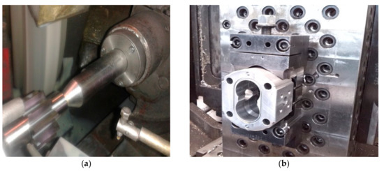 Subsequently, the technology for making new outline gear teeth was developed. Before making the wheels, the kinematics of the optimized three-involute mesh was studied for gear wheels fabricated using 3D technology. The model gear wheels shown in Figure 4a were the equivalent of the group II pump with a unit output of q = 8cm3/rpm. After positive verification of polyethylene-printed wheels, the fabrication process commenced in commercial industrial conditions, where the surface of the three-involute outline was manufactured by ground and chip technologies (Figure 4b).