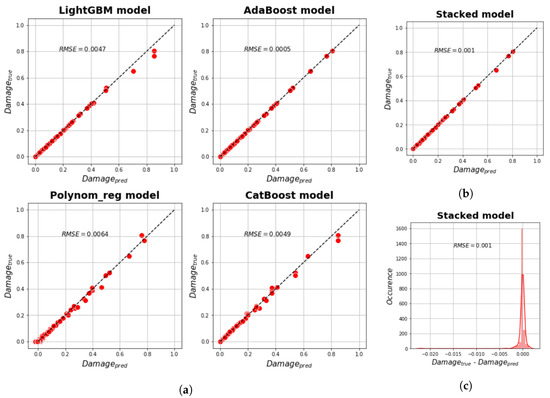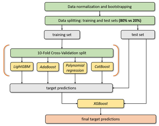 - Model training: Each so-called “weak” submodel included in the ensemble was first trained on () folds of the training data, while the remaining fold was used to make predictions, as well as an evaluation set for early stopping to prevent the submodel from overfitting. The following procedure was repeated k times for each fold. Further, this submodel was fitted on the whole training set, and predictions were then made on the test set. The submodel’s predictions from the training set were then used as features to build the master (stacked) model, which in turn was used to make final target predictions on the test set. For each of the models, the root-mean-square error (RMSE) was chosen as an objective function, as well as an accuracy metric during validation.