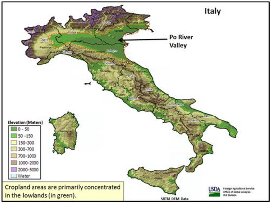 Agricultural production in Italy is concentrated along the seacoasts as well as in the Po valley. Although the precise proportions cannot be determined, it is clear from Figure 2 that nearly all of the coastal regions, except in the far northwest, are croplands [58].
