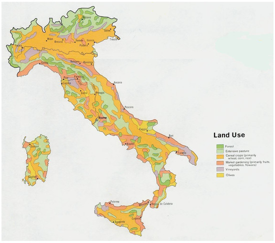 - Maps-Italy. Italy Agricultural Map. 2020. Available online: https://maps-italy.com/italy-agriculture-map (accessed on 10 November 2020).