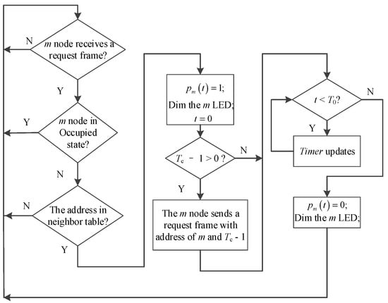 Since the illumination at the associated zone of LED n is influenced by the light outputs of LEDs in its neighborhood, the controller of LED n seeks aid from neighboring LEDs by transmitting a request frame. The request frame contains two types of data: address of transmitter and forwarding count . Consider the controller of wireless sensing module m shown in Figure 5. After reception of the request frame from LED n, the controller compares address with the stored record at its one-hop neighbor table to determine the occupancy state of m. If there is a match, which indicates m is a one-hop neighbor of n, is set to one, and the dimming level is calculated using Equation (2); namely, indicates that the associated area of m is occupied, while indicates that the associated area of m is unoccupied. Further, the controller of m determines whether to forward a request frame to its one-hop neighbors continuously. The timer value of indicates that one-hop neighbors of m are needed to provide aid to n. In this case, module m transmits a new request frame with address and forwarding count . Once Timer of m is , , and reset to the unoccupied-state values. The controller of n keeps on broadcasting request frames to alert other nodes if its occupancy state is occupied.