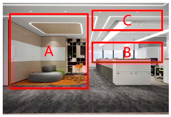 An indoor environment can be divided into multiple zones, each of which requires different lighting conditions. For instance, in Figure 6, an office space with three zone types are presented, Zones A, B, and C. Zone A is for leisure time, while zones B and C are for working. Zone B is near the windows, having great potential for harvesting daylight. On the contrary, zones A and C lack natural light, and daylight harvesting cannot be conducted in these zones. Moreover, body motion in Zone A is usually large, making it easy to sense occupancy. However, in Zones B and C, small movements often occur. The layout of the sensors is given in Table 2. The lighting control rules are obtained based on Equation (2) and considering environmental conditions and user preferences are listed in Table 3. When occupants are detected, and the associated LED is dimmed according to the rules, the neighbor LEDs will also be triggered, as presented in Figure 5.