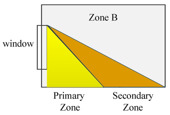 For Zone B, the control rules are the same as for Zones A and C on stages 1 and 6 when the daylight illuminance is weak and in stage 4 when the dimming level of lights are set to 10% for lunch break. In stages 2, 3, and 5, daylight harvesting is implemented in Zone B. According to the distance to the window, Zone B is subdivided into two parts: primary zone (PZ) and secondary zone (SZ), shown in Figure 7. The PZ represents the area adjacent to the window, the SZ represents the area adjacent to the PZ. The dimming level of a LED in PZ or SZ is denoted as , where . When an occupant is detected, increases by 40% with z taking the values corresponding to PZ and SZ, and the maximum value of is 100%; the value of depends on the illuminance value of daylight, and it can be expressed as follows: