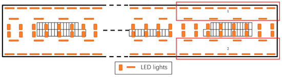 Deployment of the proposed system in the concourse level of the metro station. Comparison experiments were performed in Zones 1 and 2, which were symmetric and had the same number of LEDs. The smart lighting system was implemented in zone 1, while the normal lighting system was used in zone 2.