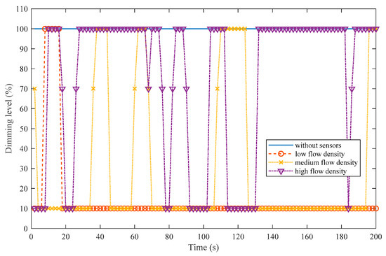 The comparison of dimming levels of a luminaire in zone 1 under different people flow densities with respect to a luminaire in zone 2 is presented in Figure 11. The lighting control strategy depicted in Section 3.3.2. was used in zone 1, and zone 2 utilized a normal lighting system without occupancy sensors in which luminaires were at a 100% dimming level during the metro operating time and most of them during the metro nonoperating time. Three types of people flow densities were considered: low density, medium density, and high density. As shown in Figure 11, with the decrease in the people flow density, the proportion of time when the dimming level was 10% increases. A higher dimming level indicated greater energy consumption. Thus, the higher the proportion of 10% level was, the more the energy savings were. Hence, the energy savings were inversely proportional to the people flow density. Accordingly, two conclusions can be drawn as follows: (1) based on the occupancy detection data presented in Figure 10, the largest energy saving occurred between 11 p.m. and 7 a.m., followed by time period from 11 a.m. to 3 p.m. and (2) the smart lighting system should be preferentially installed in metro stations with small passenger flows in order to save more energy.