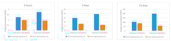In order to evaluate the proposed system in terms of power saving, the comparison experiments were conducted in two zones, which had the same geometry size and number of luminaires except for the deployment of the smart lighting control system. Each zone was further divided into two subzones, of which one had 10 LED luminaires, and the other had 13 LED luminaries. One luminaire has two LED tubes, and the specifications of luminaires are listed in Table 4. After the installation of the proposed system in zone 1, the energy consumptions of the four subzones were measured in 5 h during the periods of 3 days and 23 days, successively. The energy consumption and saving of the four subzones are presented in Figure 12 and Table 5. In the normal lighting system, subzone 2 consumed more energy than subzone 1, which was expected because subzone 2 had three more lights than subzone 1. However, in the smart lighting system, the energy consumption of subzone 2 was slightly lower than that of subzone 1, which indicated that the energy consumption under the proposed smart lighting system was independent of the number of lights. The average energy saving achieved using the proposed smart lighting system was about 45% compared to the normal lighting system.