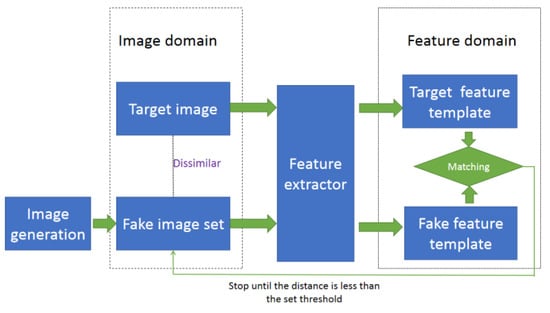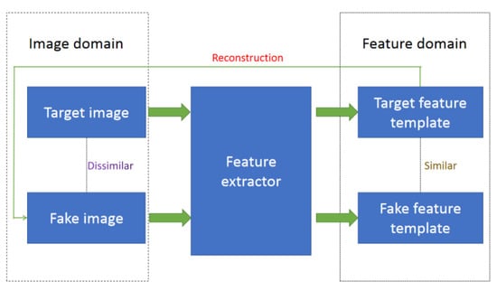 RA is shown in Figure 1. A biometric image is reconstructed from a genuine user’s target feature template in feature domain. Some evolution algorithms, such as the genetic algorithm (GA) or hill-climbing (HC) algorithm, are used to iteratively modify the fake image in image domain and continuously enhance the similarity in feature domain until RA is successful. Typically, if RA is successful, the target feature template and fake feature template are similar, while the target image and the fake image are dissimilar, because the similarity in feature domain does not ensure the similarity in image domain. In addition, since the naturalness is not considered in RA, the reconstructed fake images typically have insufficient naturalness; i.e., they have a counterfeit appearance that reveals they are not captured in natural environments. Furthermore, the evolution algorithms in RA become invalid in biocryptosystems if the extracted/recovered bio-key is strictly protected with one-way function. The correlation between the input and output is completely damaged by one-way function, so the evolution algorithms in RA cannot enhance the similarity in feature domain.